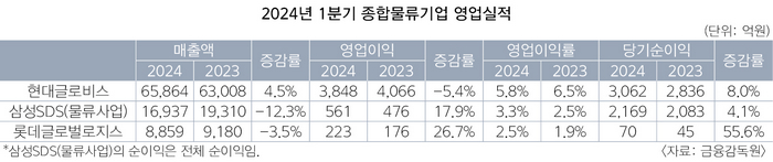 종합물류기업 3곳의 1분기 평균 영업이익률은 3.9%로 1년 전 같은 기간보다 0.3%p 상승했다. 삼성SDS(물류사업), 롯데글로벌로지스의 영업이익률은 각각 0.8%p 0.6%p 오른 3.3% 2.5%였다. 반면 현대글로비스는 0.6%p 떨어진 5.8%로 나타났다.