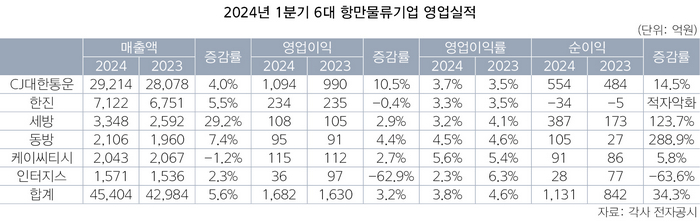 6대 항만물류기업의 1분기 평균 영업이익률은 3.8%로 전년 동기 대비 0.8%p(포인트) 후퇴했다. CJ대한통운과 케이씨티시의 영업이익률은 각각 3.7% 5.6%를 기록, 1년 전 같은 시기에 견줘 0.2%p씩 상승했다. 반면 한진, 세방, 동방, 인터지스 등 4개사는 각각 3.3% 3.2% 4.5% 2.3%의 영업이익률을 냈고, 0.2%p 0.9%p 0.1%p 4.0%p 하락했다.