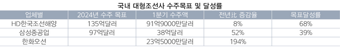 HD현대의 조선 중간 지주사 HD한국조선해양은 3개월 동안 91억9000만달러 규모의 수주액을 올렸다. 지난해 수주액 84억9600만달러와 비교해 8% 늘어난 수치다. 올해 수주 목표액인 135억달러의 68%를 달성했다. 같은 기간 삼성중공업은 수주액 38억달러를 신고했다. 3개월 동안 연간 목표 97억달러의 39%를 채웠다.