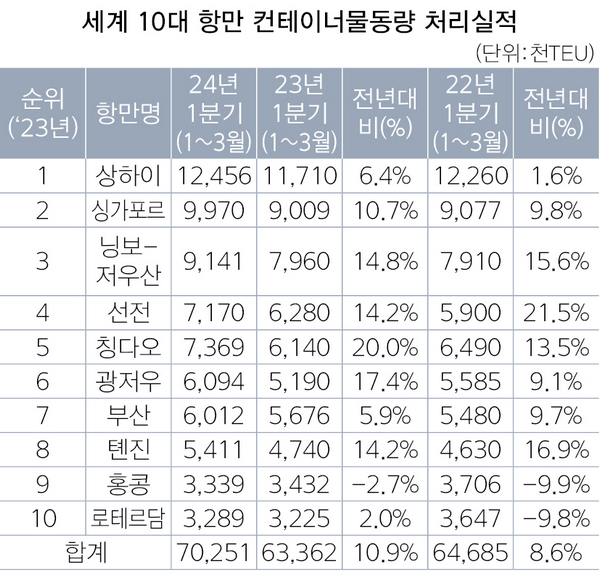 한국해양수산개발원에 따르면 올해 1분기 세계 10대 컨테이너 항만 물동량 20피트 컨테이너(TEU) 기준 7025만TEU를 기록했다. 1년 전 같은 시기(6336만TEU)에 견줘 10.9% 증가했다. 코로나19 이전 시기인 2019년(5956만TEU) 대비 18.0% 상승했다.