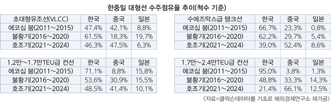 한국조선의 2011~2015년 수에즈막스 탱크선 수주 점유율은 67%에서 2021~2024년 39%로 떨어진 반면, 중국은 23%에서 52%로 껑충 뛰었다.