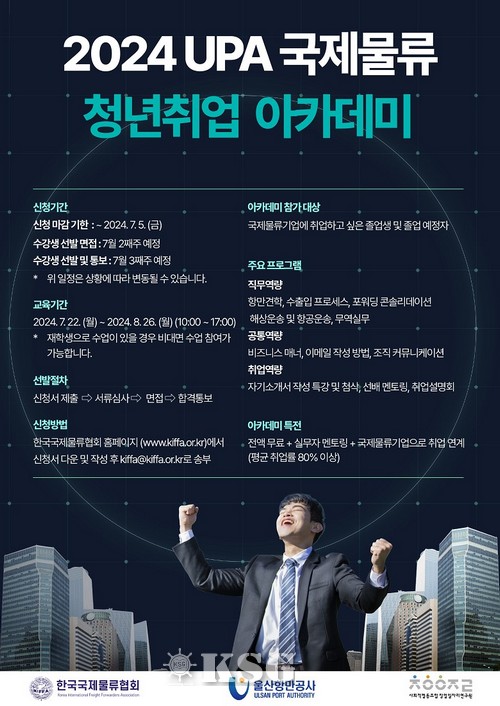 한국국제물류협회(KIFFA)는 최근 울산항만공사(UPA)와 사회적협동조합창업일자리연구원과 업무협약을 맺고 국제물류 청년취업아카데미 수강생을 모집한다고 밝혔다.
