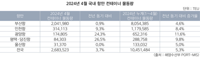 부산 광양 인천 등 국내 주요 항만의 4월 컨테이너 물동량이 플러스 성장을 이어갔다. 중국, 미국 등 주요 교역국과의 물동량이 늘어난 게 주효했다는 분석이다. 부산항은 8개월 연속, 광양항은 11개월 연속 물동량이 증가하는 등 괄목할 만한 성과를 냈다.