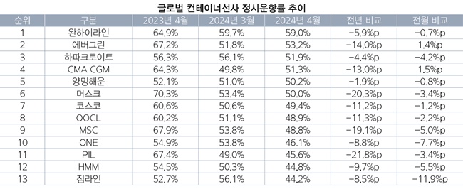 지난해 선두권을 지켰던 유럽계 선사들도 성적 하락을 맛봤다. 덴마크 머스크와 스위스 MSC는 각각 전월 대비 3.4%p 5%p 하락한 50% 48.8%에 그치며 6위와 9위에 각각 자리했다.