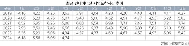 올해 4월 선사들의 평균 지연 도착 시간은 4.74일로 전월 5.06일 대비 0.32일 줄어들며 지난해 10월 이후 6개월 만에 4일대를 기록했다. 다만, 전년 4.34일과 비교하면 0.4일 늘었다.