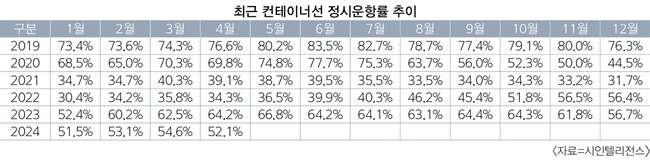 덴마크 해운조사기관인 시인텔리전스에 따르면 올해 4월 전 세계 34개 항로를 대상으로 조사한 컨테이너선사들의 평균 정시 운항률은 전월 54.6%에서 2.5%포인트(p) 떨어진 52.1%를 기록했다. 선박 2척 중 1척이 정해진 일정을 지키지 못했다.