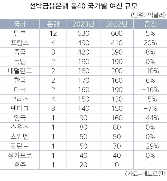 반면 2022년 톱40에 들었던 영국 HSBC, 미국 JP모건 등은 2023년엔 순위에서 탈락했다. 이들은 2년 전 90억달러, 30억달러였던 선박금융 규모를 지난해 대폭 줄였다.