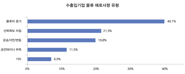 또 250개사는 선복 확보와 예약(부킹) 차질도 수출입 부담을 가중하는 요인이라고 호소했다. 이 밖에 선박 스케줄 지연·변동(230개사), 공컨테이너 확보 차질(138개사)등이 물류 애로사항으로 지적됐다.