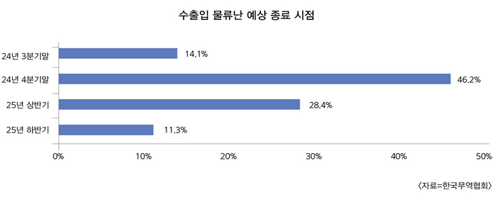 수출입 기업은 설문조사에서 해상운임 상승과 물류 불안정이 적어도 올해 연말까지 지속될 것으로 내다봤다. 응답 기업의 절반가량인 46%는 올해 4분기 말까지 운임이 상승할 것으로 전망했으며, 28%는 내년 상반기까지 지속될 것으로 예상했다.