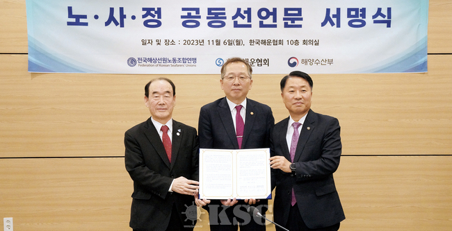 | ▲지난해 11월6일 해운협회 선원노련 해양수산부는 서울 여의도 해운빌딩 에서 한국인 선원 일자리 혁신을 위한 노사정 공동선언문을 발표했다. 합의서엔 국제선박에 승선하는 한국인 선원(예비원 포함)을 5000명 이상으로 유지하는 한편 유급휴가 일수를 8일에서 10일로 확대하는 내용이 담겼다. |