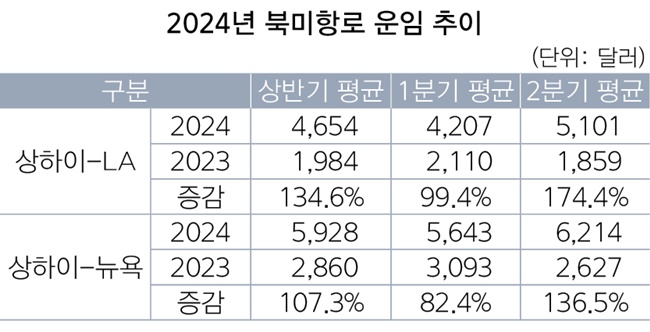 북미항로에선 파나마운하가 통항이 여전히 어려운 상황에서 중국발 밀어내기 물량까지 늘면서 운임이 상승했다. 영국 해운조사기관인 드류리에 따르면 올해 상반기 상하이-로스앤젤레스(LA) 구간 평균 운임은 40피트 컨테이너(FEU)당 4654달러를 기록, 1년 전의 1984달러에서 2.4배(135%)나 뛰었다.