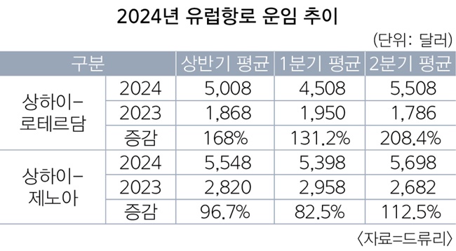 유럽항로는 홍해 사태 직격탄을 그대로 맞았다. 선사들이 남아프리카공화국 희망봉으로 경유를 결정하면서 운송 거리와 시간이 늘어난 가운데 2분기부터 선복 부족 현상이 심화하면서 운임이 크게 올랐다. 여기에 독일, 이탈리아 등에서 발생한 파업에 따른 항만에서의 장기 적체도 선박 공급에 영향을 미치며 운임 상승으로 이어졌다.