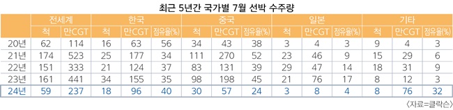 우리나라는 7월 한 달간 96만t을 수주, 57만t을 기록한 중국을 크게 앞서며 17개월 만에 세계 1위에 올랐다. 같은 기간 일본 조선은 수주량이 8만t에 그친 것으로 파악됐다. 수주 점유율은 우리나라가 40%로, 24%에 그친 중국을 압도했다. 3위 일본은 4%로 한국과 중국의 양강 체제가 지속되고 있다.