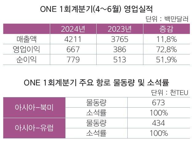 ONE은 영업보고서에서 2024회계연도 1분기(4~6월)에 영업이익 6억6700만달러(약 9000억원), 순이익 7억7900만달러(약 1조1000억원)를 각각 거뒀다고 밝혔다. 1년 전의 3억8600만달러 5억1300만달러에 견줘 영업이익은 73%, 순이익은 52% 신장했다. 매출액은 전년 37억6500만달러에서 42억1100만달러(약 5조7000억원)로 12% 증가했다.