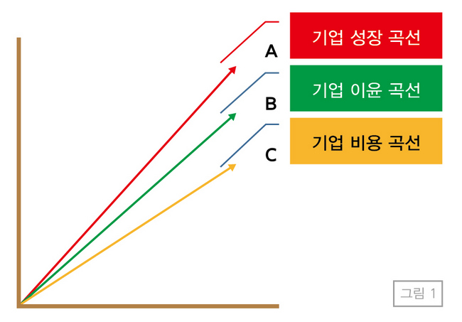 이를 기업의 성장곡선과 이윤곡선 그리고 비용곡선만으로 살펴보면 다음과같다. 기업의 성장곡선과 기업의 이윤곡선이 기업의 비용곡선보다 우위인 상태가 지속적으로 이어진다면 기업 입장에선 성장과 이윤의 실현이 발생 비용보다 더 우위에 있으므로 구성원의 고용안정화와 복지의 증진에 더 많은 투자를 할 것이다.