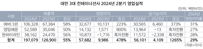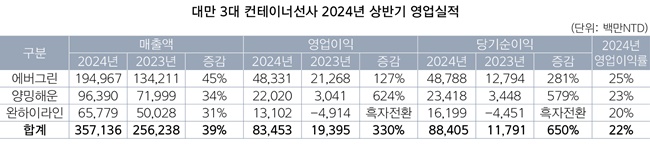 각사 공시에 따르면 4~6월 3개 선사의 영업이익과 당기순이익 총액은 각각 577억대만달러(NTD, 약 2조4300억원) 561억NTD(약 2조3600억원)로 2023년 같은 기간 100억NTD 41억NTD에서 각각 5.8배(478%) 13.7배(1265%) 폭증했다.