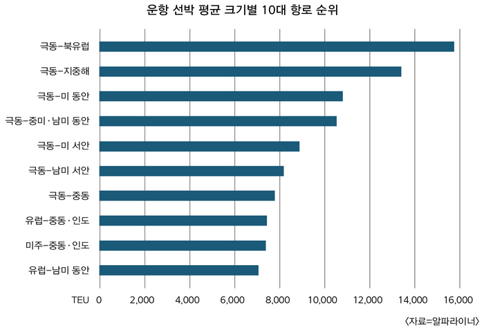 노선별 선박 크기를 보면 알파라이너의 분석을 바로 이해할 수 있다. 평균 선형이 가장 큰 시장은 극동-유럽항로로, 무려 1만4600TEU에 이른다. 알파라이너는 1만8000TEU급 극초대형 컨테이너선의 94%가 유럽항로를 운항한다고 전했다. 세부적으로 극동-북유럽항로 1만5600TEU, 극동-지중해항로 1만3300TEU 정도다.