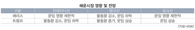 반면, 해리스는 중국과 디리스킹(위험 완화) 정책을 채택, 해상물동량 및 운임에 미치는 영향이 제한적일 것으로 관측했다.