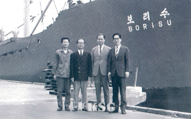 | ▲1970년경 계획조선 4차선 <보리수>호의 일본 요코하마항 입항 기념 사진. 왼쪽에서 2번째부터 양원석 선장과 신태범 회장, 이윤수 전 KCTC 부회장 |