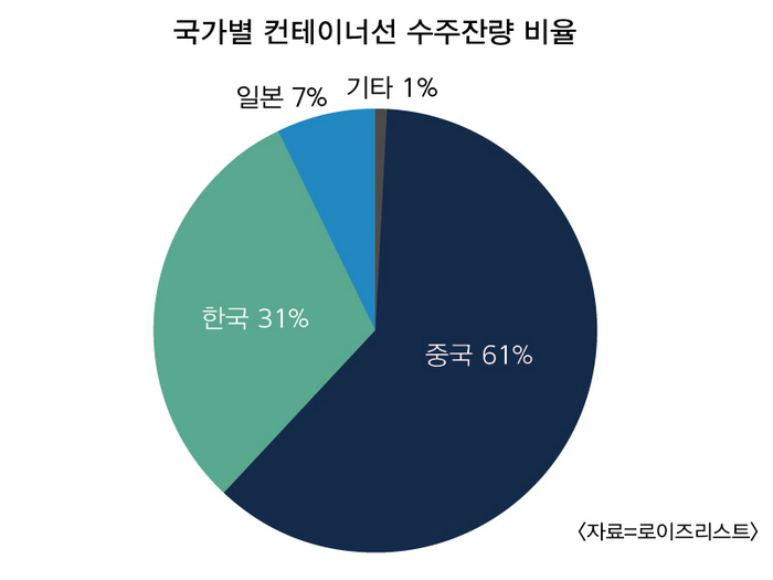 컨테이너선 수주잔량을 국가별로 보면, 중국이 차지하는 비중이 상당하다. 중국은 현재 전 세계 컨테이너선 주문량의 61%를 보유하고 있다. 31%의 우리나라를 2배가량 웃도는 수치다. 일본은 7%에 불과했다.