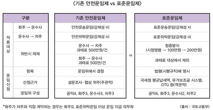 화물차 안전운임제 재도입 법안이 국회에 발의된 가운데 제도 찬반 논의가 가열되고 있다. 민주노총 공공운수노동조합 화물연대본부는 기존 안전운임제에서 실효성을 높여 재도입해야 한다고 주장하는 반면, 정부 측은 시장 자율성을 더 강조한 표준운임제 도입을 고수하고 있다.