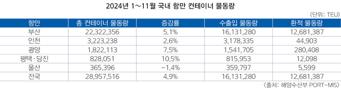 해양수산부에 따르면 올해 1~11월 우리나라 전국 항만에서 처리한 컨테이너 화물은 전년 동기 대비 약 5% 증가한 2895만7500TEU를 기록했다. 수출입과 환적 물량 모두 확대됐다. 수출입화물은 2% 늘어난 1613만1300TEU였다. 이 가운데 수입은 804만2100TEU로 3%, 수출은 808만9200TEU로 2% 늘었다. 환적화물은 9% 증가한 1268만1400TEU로 집계됐다. 이 같은 추세면 12월 화물을 더한 올해 총 컨테이너 물동량은 이전 최대인 지난해 실적 3014만TEU를 넘어설 것으로 전망된다.