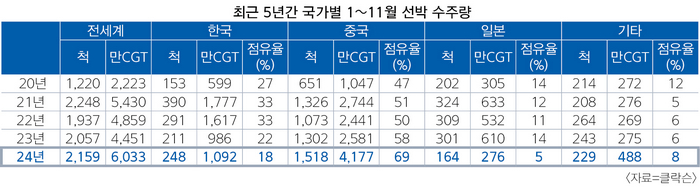 영국 조선해운조사기관인 클락슨에 따르면 올해 1~11월 국가별 수주실적에서 중국이 우리나라를 크게 앞섰다. 중국 4177만t(CGT·수정환산톤), 우리나라 1092만t으로, 전년 2581만t 986만t 대비 61.8% 10.8% 각각 늘어난 실적을 거뒀다. 점유율은 각각 69% 18%로 집계됐다. 3위 일본의 수주량은 전년 610만t 대비 54.8% 급감한 276만t이었다. 점유율은 5%에 그쳤다.