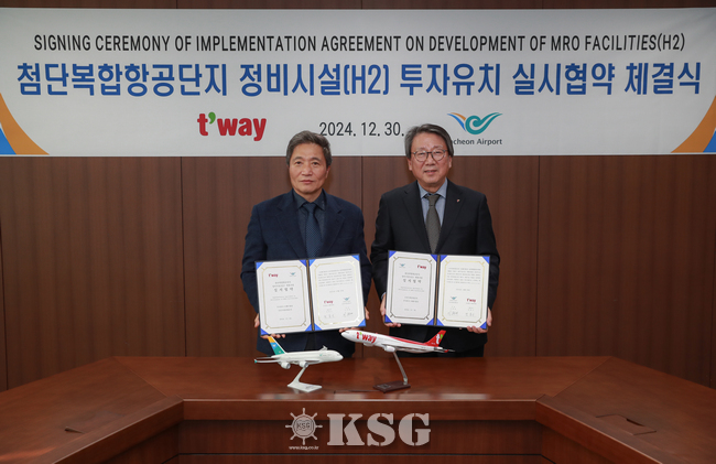 인천국제공항공사는 지난 12월30일 공사 청사에서 티웨이항공과 첨단복합항공단지 신규 항공기 정비시설 투자유치에 관한 실시협약(MOU)을 체결했다고 6일 밝혔다. 이 협약에 따라 티웨이항공은 약 350석 규모의 E급 항공기 1대와 190석 규모의 C급 항공기 4대를 동시에 정비할 수 있는 격납고를 구축할 계획이다.