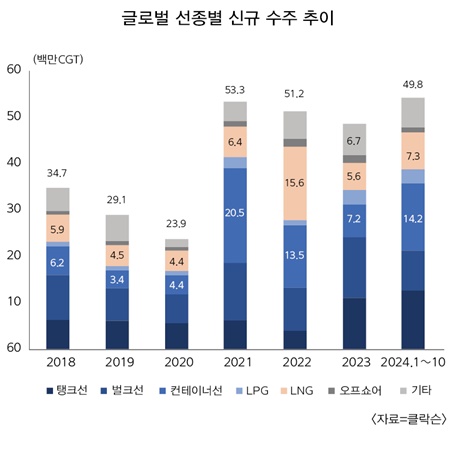 반면, LNG 운반선은 대규모 발주가 진행됐음에도 향후 예정된 LNG 프로젝트가 상당해 중장기 수주 전망이 양호할 것으로 예측했다. 특히 트럼프 미국 대통령의 재집권은 LNG 운반선과 함정 건조에서 두각을 드러내고 있는 국내 조선업계에 호재로 작용할 것으로 봤다.