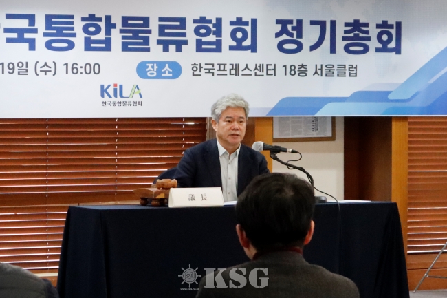 | ▲한국통합물류협회(KILA) 신영수 협회장이 정기총회를 진행하고 있다. |