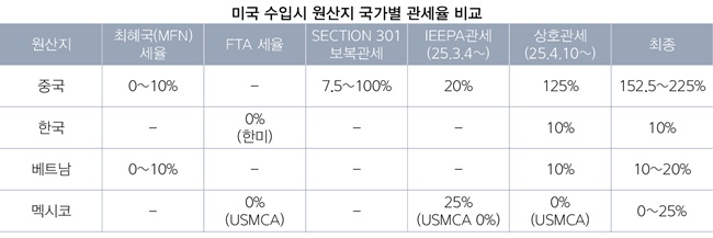 멕시코에서 생산한 USMCA원산지물품은 상호관세 대상도 아니며 국제비상경제권한법(IEEPA) 멕시코 25% 관세도 면제된다. 수출물품의 부품 또는 원료가 중국산이 사용되거나 제조공정 일부가 중국에서 수행되는 경우 상호관세 125%에 지난 3월4일 부과한 IEEPA를 근거로 추가 관세 20%까지 총 145%의 추가 관세가 부과된다. 여기서 무역법 301조(SECTION 301) 해당 물품은 관세율이 또 추가된다.