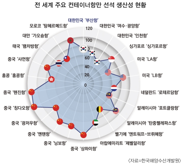항만별로도 국내 주요 항만은 선석 생산성이 전년 대비 약보합세였다. 모든 선박 기준으로 부산항은 74.9회, 여수·광양항은 68.6회, 인천항은 56회를 기록했다. 각각 1년 전에 견줘 0.1% 0.7% 5.5% 줄었다. 다만 전 세계 순위에서 부산항은 4계단 오른 28위, 여수·광양항은 3계단 오른 41위를 기록했다. 인천항은 3계단 내려온 72위였다. (
