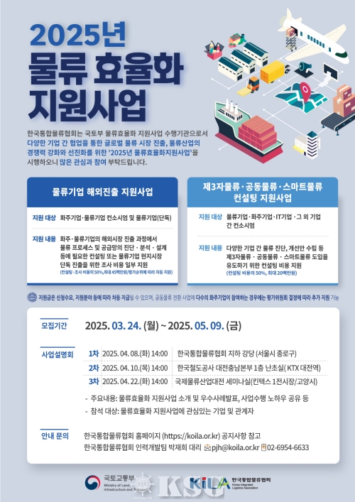 국토교통부와 한국통합물류협회가 물류산업의 경쟁력을 강화하고자 2025년 물류 효율화 지원 사업을 진행한다.