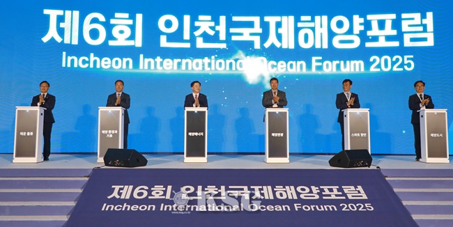 | ▲왼쪽부터 김성범 해수부 차관, 유정복 인천시장, 이경규 IPA 사장, 황대일 연합뉴스 대표, 조명우 포럼위원장(인하대 총장), 정일영 국회의원이 오프닝 세리머니를 한 후 박수를 치고 있다. |