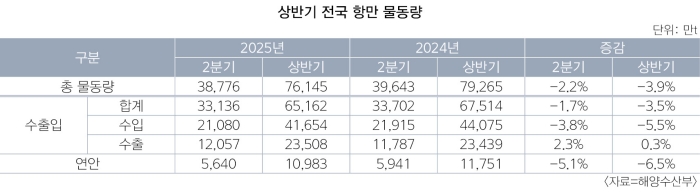 부산 광양 등 국내 주요 항만이 글로벌 통상환경의 불확실성이 고조되는 상황에서도 지난해와 비슷한 수준으로 컨테이너 물동량을 처리하며 소폭 성장했다. 반면 비컨테이너 화물 실적을 포함한 전체 항만 물동량은 2분기에도 전년 대비 감소하면서 상반기를 저조한 성적으로 마무리했다.