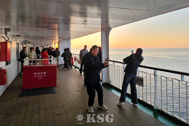 한국에서 출발할 때는 중국인 관광객이 대부분이었지만 중국에서 돌아올 땐 한국인 단체 관광객이 다수를 차지해 눈길을 끌었다. 최근 한중 간 국제여객선은 중국인 이용객이 90%인데 이번엔 이례적이라고 선사 측은 설명했다.