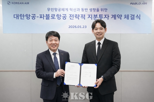 대한항공은 지난 23일 서울 중구 서소문 사옥에서 파블로항공과 전략적 지분 투자 계약을 체결했다. 체결식에는 임진규 대한항공 항공우주사업본부장(