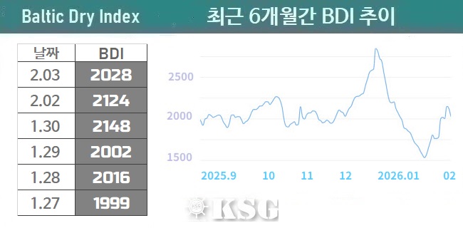 2월 첫째 주 벌크선시장은 견조한 물동량과 선복 부족으로 강세가 유지됐다. 2월3일 건화물선 운임지수(BDI)는 2028로 발표됐다. 한국해양진흥공사가 공표한 한국형 건화물선 운임지수(KDCI)는 1만9359로 마감됐다.