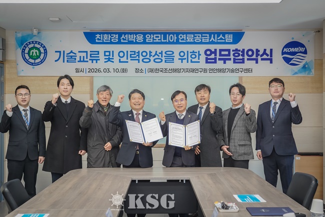 한국조선해양기자재연구원(KOMERI)과 국립목포해양대학교는 지난 10일 전남 목포 신항만 배후 단지에 위치한 KOMERI 연안해상기술연구센터에서 ‘친환경 선박용 암모니아 연료공급시스템 기술 교류 및 인력 양성’을 위한 업무협약(MOU)을 체결했다고 밝혔다.