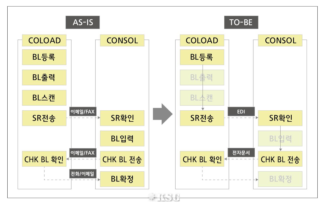 그동안 화주(프레이트포워더)가 콘솔사로부터 체크B/L을 받기 위해선 여러 단계와 시간을 들여야 했다. B/L을 출력하고 스캔한 뒤 이메일과 팩스로 콘솔사에 선적요청서(SR)를 전송하면 콘솔사들은 SR을 확인하고 B/L을 입력한 후 체크B/L을 화주에게 전송하고 다시 전송 확인을 받는 식이다.