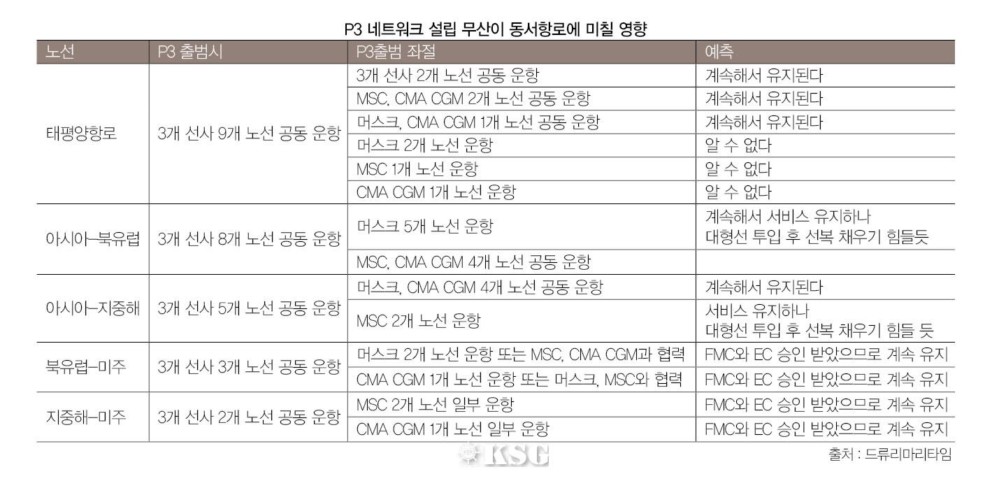 P3 출범이 운임에 미칠 영향은 각자 입장에 따라 다르게 예측돼왔다. P3 참여 선사들은 운항은 함께 하지만 영업은 같이 하기 때문에 낮은 운임으로 화주들의 마음을 잡아야 한다고 말해 왔다. 반면 화주들은 점유율이 큰 세 선사가 작정하고 무분별하게 운임을 올릴 것이라 우려했다. P3의 출범이 좌절된 지금, 정기선사 관계자들은 당분간 눈에 띄는 운임의 등락은 없을 것으로 예상하고 있었다.