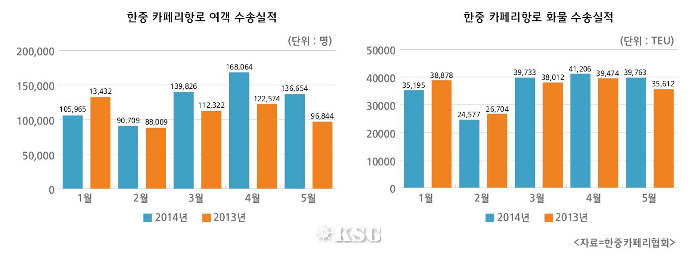 한중카페리항로의 수송실적은 <세월>호의 영향을 크게 받지 않고 있는 것으로 분석됐다. 한중카페리협회(KCCA)에 따르면 5월 한중 카페리항로 14개노선의 수송 실적은 여객 13만6600명 화물 3만9만700TEU를 기록했다. 지난해 같은 달에 견줘 여객은 9만6800명에서 41.1%, 화물은 3만5600TEU에서 11.7% 각각 성장했다. 다수의 노선들이 성장을 일군 데다 평택-르자오항로가 재취항하면서 전년 대비 실적 상승을 일궜다.