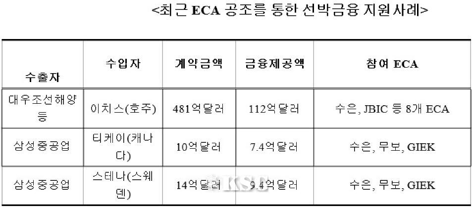 최근 선박금융 시장은 초대형ㆍ고부가가치 선박 발주가 늘어남에 따라 금융 규모도 그만큼 커지고 있어 금융기관간 협조융자 필요성이 더욱 부각되고 있다. 특히 유럽계 상업은행들이 선박금융을 대폭 축소하고 있어, 각국의 수출신용기관(ECA)간 협력이 선박금융 성사에 필수요소로 떠오르는 상황이다.