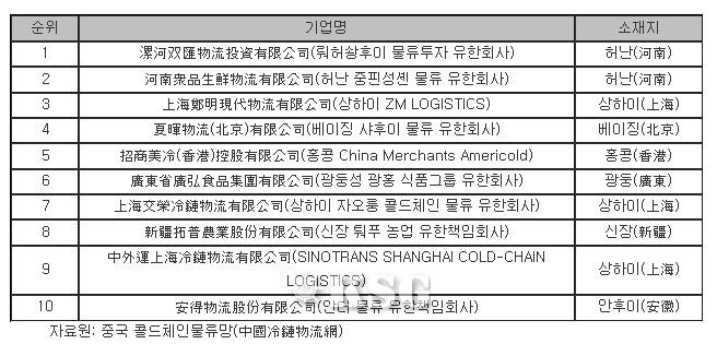 중국 콜드체인 물류망에서 중국 콜드체인 물류 상위 10대 기업을 발표했다. 자료를 분석해보면 화남, 화중, 화북 일대에서 콜드체인 물류가 발전하는 반면, 서북, 동북, 화동 일대는 상대적으로 발전이 더딘 것으로 나타났다.