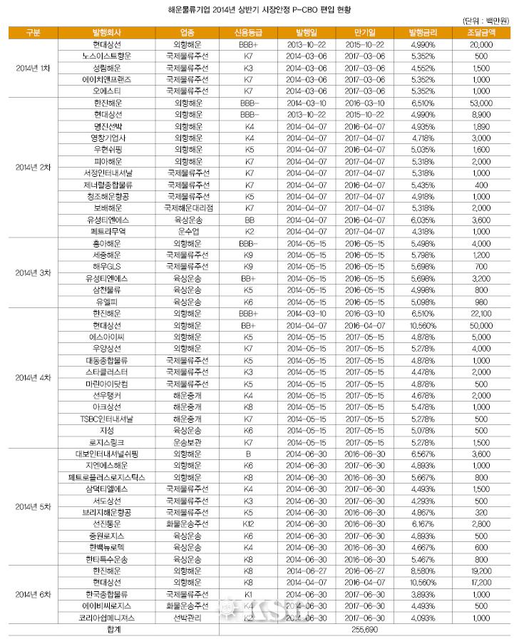 해운물류기업은 상반기동안 총 44곳에서 2556억9000만원을 P-CBO를 통해 조달했다. 이 중 85%인 2172억9000만원이 외항해운기업 지원에 쓰였다. 혜택을 받은 외항해운기업 수는 총 12곳이다. 국내 양대 해운사인 한진해운과 현대상선을 비롯해 흥아해운 에스아이씨 우양상선 대보인터내셔널쉬핑 등이다.