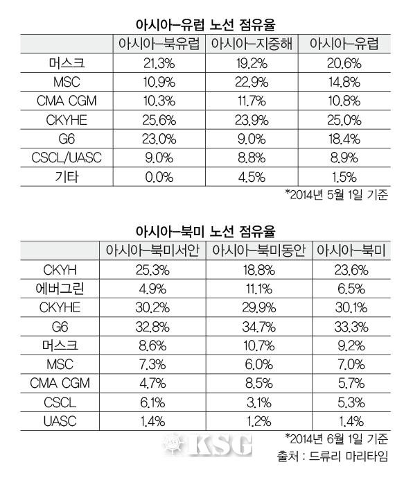 알파라이너는 CMA CGM과 UASC, 차이나쉬핑이 얼라이언스를 결성한다면 동서 항로는 2M, G6, CKYHE를 비롯한 4개의 얼라이언스의 경쟁터가 될 것이라 예측했다. 올해 5월1일 기준으로 아시아-북유럽 노선에서 CMA CGM은 10.3%의 점유율을, 차이나쉬핑과 UASC는 9%의 점유율을 차지한 것으로 나타났다. 세 선사의 점유율을 단순히 합치면 19.3%다. 아시아-지중해 노선의 경우 CMA CGM이 11.7%, 차이나쉬핑과 UASC가 8.8%로 충분히 네 번째 얼라이언스로 탄생할 수 있는 잠재력을 갖고 있다.