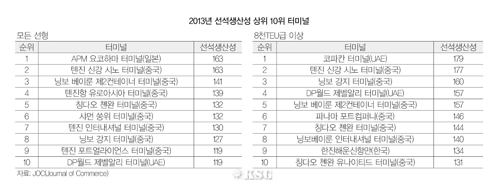 항만터미널 선석생산성 순위에서는 부산 신항 터미널운영사인 한진해운신항만(HJNC)이 9위에 자리했다.