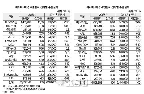 북미 수출항로 상반기 물동량이 700만TEU를 목전에 두며 사상 최대 실적을 신고했다. 이 항로 최대 수송 선사는 덴마크의 머스크라인으로 집계됐다. 우리나라 한진해운은 3위를 유지했다.