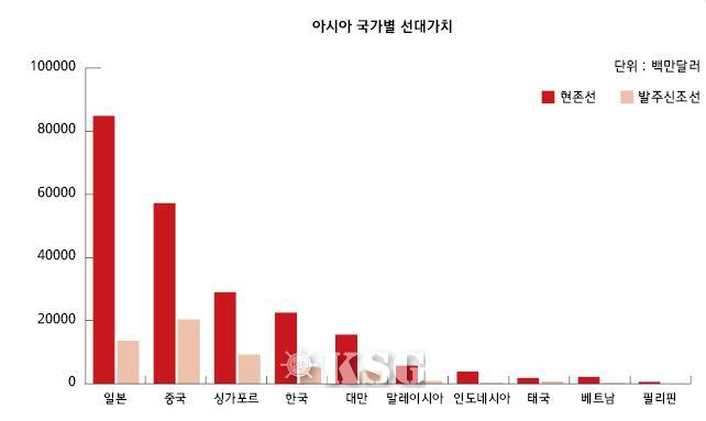 신조선 발주량으로 따져 아시아 1위는 중국이다. 중국은 발주량이 459척 3354만4000t으로 신조선의 전쳬가격은 203억5400만달러에 이른다. 일본의 신조선 발주량은 234척 1657만8000t으로 신조선가격은 135억5900만달러에 그치는 것으로 파악됐다.