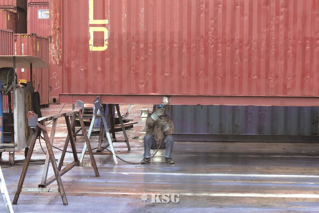 컨테이너 수리공이 컨테이너 하단에서 용접을 하는 모습이 위태롭다.